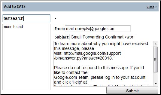 While viewing any message, plugin embedds "Add to CATS" button. By pressing this button selected text or entire message will be opened for pre-editing and posting in new form.