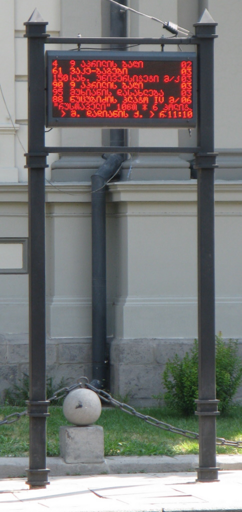 Very well-developed bus. At each stop hanging placards with the arrival time of each route numbers. Travel costs 50 tetri machine located at each bus takes the coin 10,20,50, and prints the ticket. You can save money if you use a card out of the subway, then on the second day of a trip will cost 30, while the third and then a total of 20 Tetri.