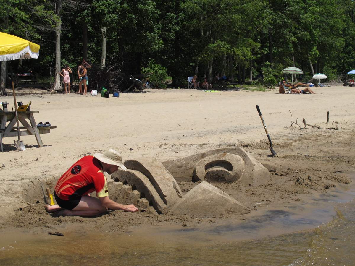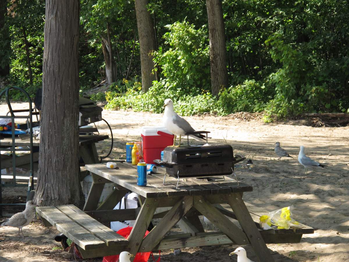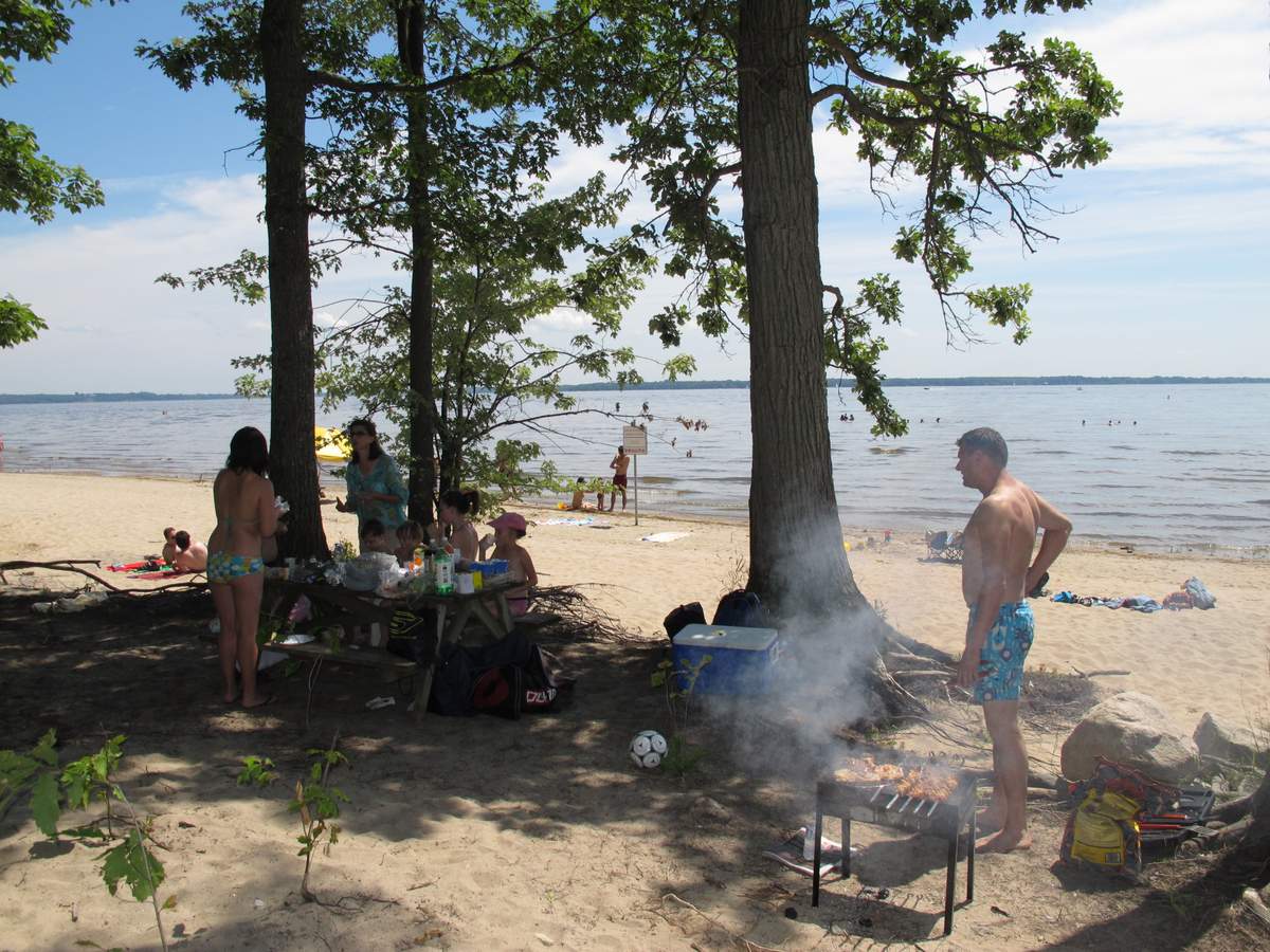 Нашли уютное место прямо на пляже под тенью нависавших над нами деревьев. Пляж повсеместно оборудован столиками для семейного пикника. Что сказать - идилия! Вода спасала от жары. Тут же, в нескольких метрах от воды, можно пожарить шашлык. В парке много людей жарили шашлык (здесь более политкорректно говорить - "барбекю"), дым от которого окутал берег и приятно дурманил голову. На дровах, угле, газе, да и на всех возможных видах мангалов.